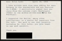 Recommends Michael Lerner, the editor of TIKKUN magazine, to be interviewed by Brian Lamb. Attached is an editorial about environmentalism and a letter explaining TIKKUN's status financially and publicly.