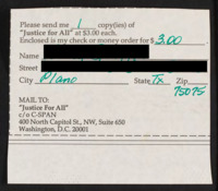 Encloses check for C-SPAN book on law, asks for information about other publications.