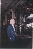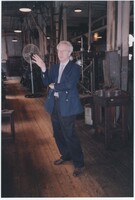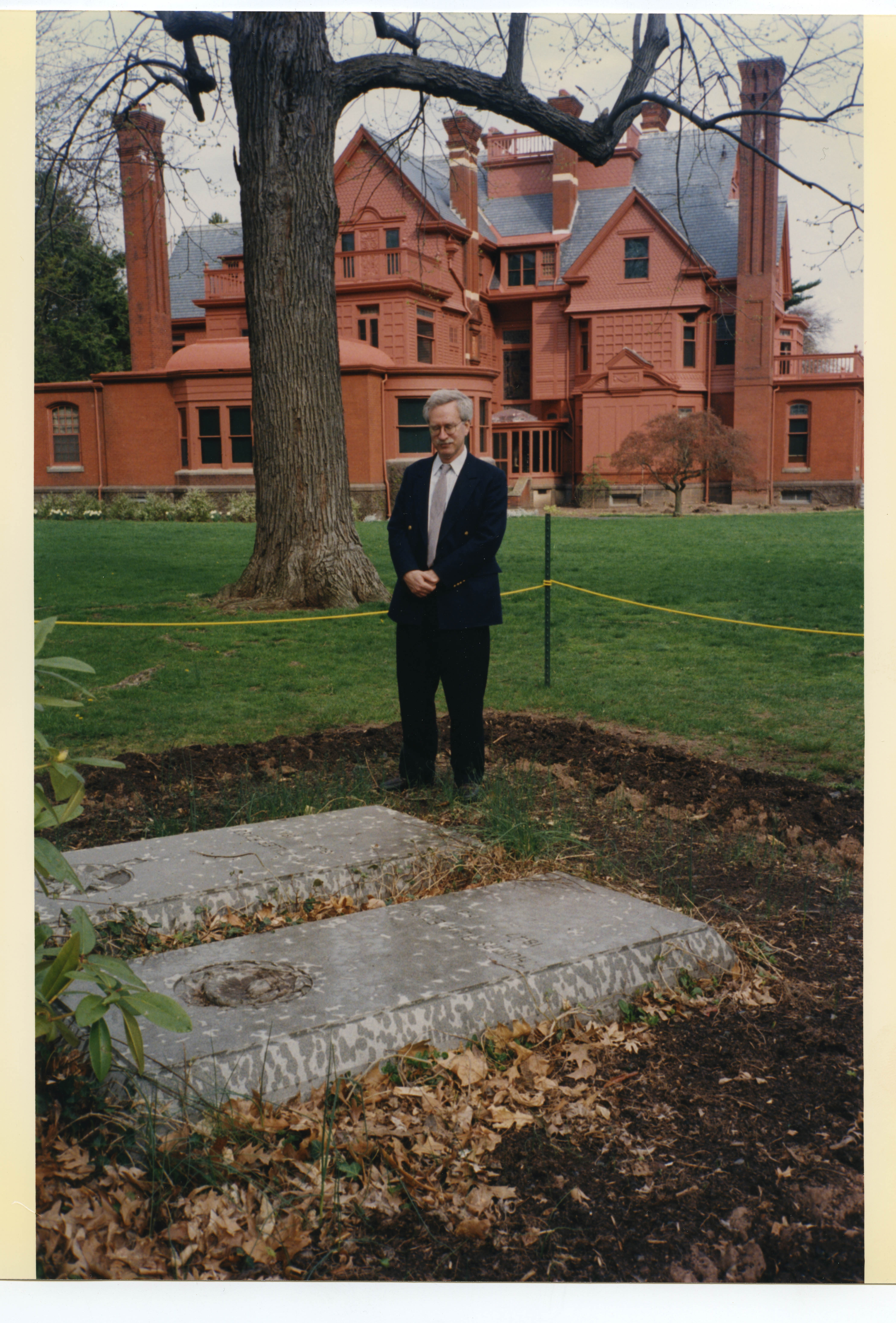 Neil Baldwin standing in a large outdoor plaza at the Thomas Edison National Historical Park with a few brick buildings and a water tower in the background.
