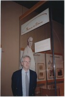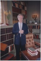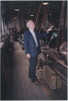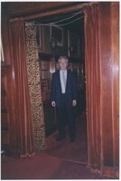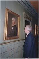 Neil Baldwin standing on a staircase within the Thomas Edison National Historical Park. A large painting of a person reading while in bed hangs behind him.