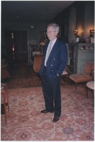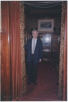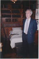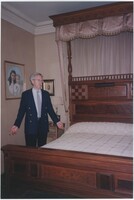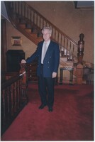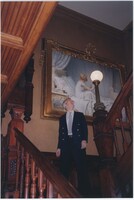 Neil Baldwin standing on a staircase located inside the Thomas Edison National Historical Park. A large painting of a person reading in bed hangs behind him.