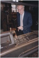 Neil Baldwin looking towards the ceiling while standing on a staircase within the Thomas Edison National Historical Park. A large painting of a person reading while in bed hangs behind him.