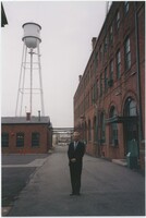 Neil Baldwin standing in a large outdoor plaza in the Thomas Edison National Historical Park with a few brick buildings and a water tower in the background.