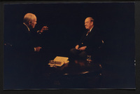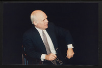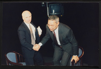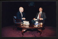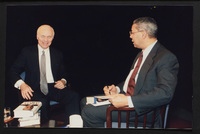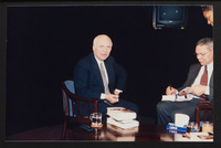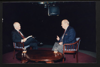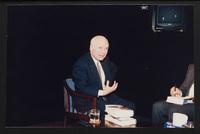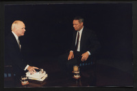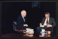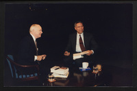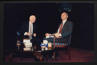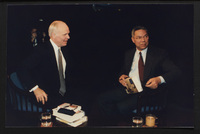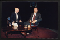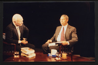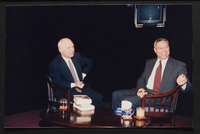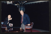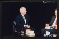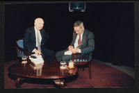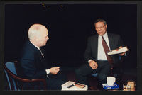 Brian Lamb points away as he sits with journalist Charles Kuralt, who begins to stand, when Kuralt appeared on Booknotes to discuss his book "Charles Kuralt's America."