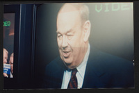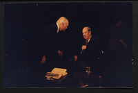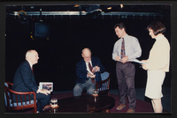 Charles Kuralt caps a pen while a person standing nearby looks at a copy of Kuralt's book "Charles Kuralt's America" when Kuralt appeared on Booknotes.
