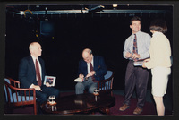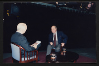 Brian Lamb sits with former Secretary of State Colin Powell as camera crew members look on when Powell appeared on Booknotes to discuss his book "My American Journey."