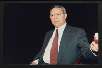 Brian Lamb speaks to someone off camera while he sits with former Secretary of State Colin Powell when Powell appeared on Booknotes to discuss his book "My American Journey."