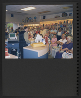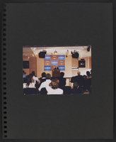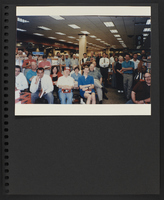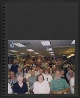 A scrapbook page with a photograph of a crowd of seated and standing people standing in what may be a bookstore. Most are holding copies of the first Booknotes book.