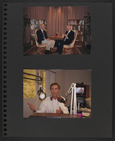 A scrapbook page featuring two photographs. The top photograph is of Brian Lamb and an unidentified person seated in two chairs placed in front of two small bookcases. The bottom photograph is of a person with headphones around their neck, speaking into radio microphones.