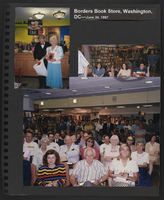 A scrapbook page with three photographs of people gathered at a Borders bookstore in Washington, D.C. The images are of two people holding copies of the Booknotes book, a group of young people sitting in the bookstore, and a large audience of seated and standing people looking at the camera.