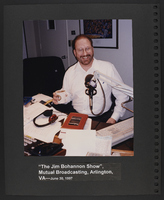 A scrapbook page with a photograph of Jim Bohannon, from an event with "The Jim Bohannon Show" on Mutual Broadcasting. The image is of Jim Bohannon seated at a desk with radio broadcasting equipment, a cup of coffee in hand, and papers, including the Booknotes book, on his desk.
