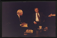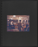 A scrapbook with a photograph of an unidentified man, seated at a cafeteria table, which has two coffee cups, an audio recorder, notepad and pen, and two copies of the Booknotes book on top.