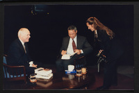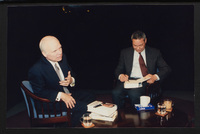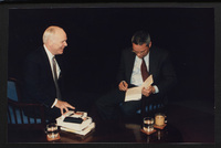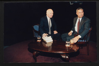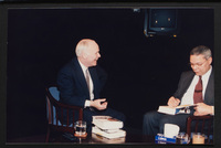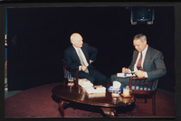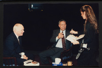 Brian Lamb sits with former Secretary of State Colin Powell as camera crew members look on when Powell appeared on Booknotes to discuss his book "My American Journey."