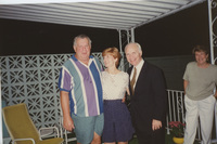 Brian Lamb stands on a porch posing with two people. This photograph was taken as part of filming C-SPAN's Lincoln-Douglas Debates series in Alton, Illinois.