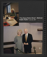A scrapbook page featuring two photographs taken from Brian Lamb's visit to "the Diane Rehm Show" on National Public Radio. The images depict Diane Rehm speaking into a microphone with the Booknotes book near her and a photograph of Brian Lamb and Diane Rehm standing next to each other near two microphones.