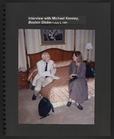A scrapbook page with a photograph of two individuals, depicting an interview with Michael Kenney of the Boston Globe. The photograph depicts two people, seated on a bed and speaking in what may be a hotel room.