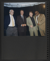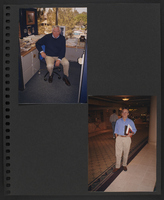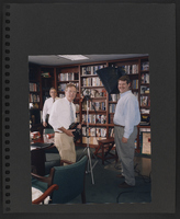 A scrapbook page with three photographs commemorating a visit of Brian Lamb to the "David Brudnoy Show," on WBZ Radio in Boston. The images depict Brian Lamb and David Brudnoy standing in front of a large bookcase, David Brudnoy standing near some tall bookcases, and David Brudnoy seated near some radio broadcasting equipment in a room with a lot of bookcases.