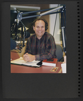 A scrapbook page with a photograph of a person wearing headphones seated at a desk in front of radio microphones, with papers and a copy of the Booknotes book on the desk.