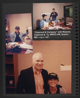 A scrapbook page with three photographs commemorating a visit of Brian Lamb to the radio show "Claprood & Company" for WRKO-AM in Boston. The images depict Marjorie Claprood wearing headphones and holding her arms up, Marjorie Claprood being handed something by an unidentified person, and a picture of Marjorie Claprood wearing headphones, seated next to Brian Lamb.