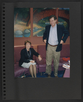 A scrapbook page with a photograph of Susan Swain and an unidentified person. Susan Swain is seated on a dark-colored couch; the other person is standing with hands in pockets in front of the couch.