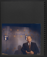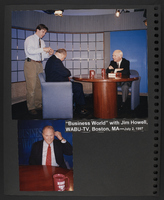 A scrapbook page featuring two photographs of an interview Brian Lamb did for the program "Business World" with Jim Howell, on WABU-TV. The images are of Brian Lamb seated with Jim Howell, as an unidentified person adjusts the microphone on Howell, and of Jim Howell adjusting something in his ear while seated in front of a table.