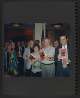 A scrapbook page of two photographs. The top photograph is of a group of people holding drinking glasses in a room with some photographs on the walls. The bottom photograph is of Brian Lamb standing at a podium on a large stage.