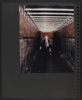 A scrapbook page with two photographs. The top photograph is of a person sitting on a rolling chair in an office. The bottom photograph is of a person standing in a large hallway, holding a copy of the first Booknotes book.