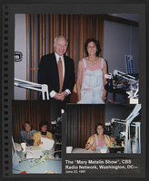 A scrapbook page featuring three photographs taken from Brian Lamb's visit to the "Mary Matalin Show" radio show in Washington, D.C. The images are of Brian Lamb and Mary Matalin standing near radio broadcast equipment, Mary Matalin and an unidentified person near audio equipment, and Mart Matalin wearing headphones near radio broadcast equipment.