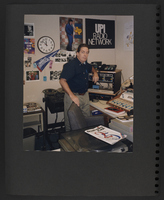 A scrapbook page of three photographs. The top left photograph is of a man in a room with some audio equipment, seated at a desk and arranging papers. The top right photograph is of Brian Lamb standing next to an unidentified person seated at a radio microphone. The bottom photo is of Brian Lamb and an unidentified person seated in a studio, holding open a copy of the first Booknotes book.