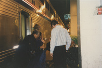 Brian Lamb poses with an elderly person outdoors at the Galesburg, Illinois train station. This photograph was taken while the C-SPAN crew was en route from Chicago, Illinois to Galesburg, Illinois while filming the Lincoln-Douglas Debates series.