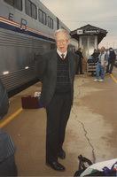 A person holding several garment bags poses while waiting to board a train. This photograph was taken while the C-SPAN crew was en route from Chicago, Illinois to Galesburg, Illinois while filming the Lincoln-Douglas Debates series.