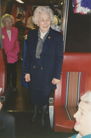 An elderly person stands next to the seat of a train car as others stand around. This photograph was taken while the C-SPAN crew was en route from Chicago, Illinois to Galesburg, Illinois while filming the Lincoln-Douglas Debates series.