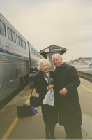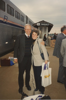 Two people pose together on the platform at the Galesburg, Illinois train station. This photograph was taken while the C-SPAN crew was en route from Chicago, Illinois to Galesburg, Illinois while filming the Lincoln-Douglas Debates series.