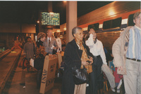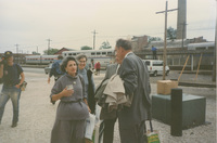 An elderly person along with some other adults and children wait to board a train. This photograph was taken while the C-SPAN crew was en route from Chicago, Illinois to Galesburg, Illinois while filming the Lincoln-Douglas Debates series.