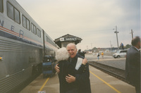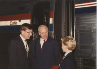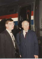 Brian Lamb stands next to Mayor Fred Kimble outside a train. This photograph was taken while the C-SPAN crew was en route from Chicago, Illinois to Galesburg, Illinois while filming the Lincoln-Douglas Debates series.