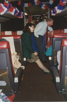 Two people stand in the aisle of a train car decorated with red, white, and blue balloons and streamers. This photograph was taken while the C-SPAN crew was en route from Chicago, Illinois to Galesburg, Illinois while filming the Lincoln-Douglas Debates series.