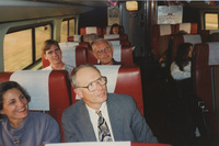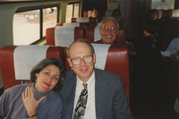 Kathy and Jim Poole sit next to each other on a train while other passengers smile behind them. This photograph was taken while the C-SPAN crew was en route from Chicago, Illinois to Galesburg, Illinois while filming the Lincoln-Douglas Debates series.