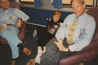 Brian Lamb speaks to a person seated on a train while the person in the row ahead stands turned around to join the conversation. This photograph was taken while the C-SPAN crew was en route from Chicago, Illinois to Galesburg, Illinois while filming the Lincoln-Douglas Debates series.