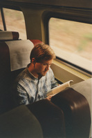 A person sitting on a train reads a book. This photograph was taken while the C-SPAN crew was en route from Chicago, Illinois to Galesburg, Illinois while filming the Lincoln-Douglas Debates series.