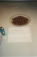 A glass bowl of chocolate malt balls on a countertop with a note that reads "Welcome Aboard & Have a (malt) Ball from the Conductors." This photograph was taken while the C-SPAN crew was en route from Chicago, Illinois to Galesburg, Illinois while filming the Lincoln-Douglas Debates series.