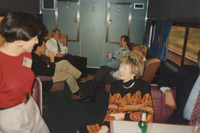 A group of people sit in chairs in a train car chatting with each other. This photograph was taken while the C-SPAN crew was en route from Chicago, Illinois to Galesburg, Illinois while filming the Lincoln-Douglas Debates series.