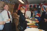 People stand near a table filled with various food and drink refreshments. Decorations on the walls around them celebrate the Lincoln-Douglas Debates series. This photograph was taken while the C-SPAN crew was en route from Chicago, Illinois to Galesburg, Illinois while filming the Lincoln-Douglas Debates series.
