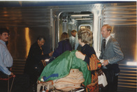 Susan Swain and others load luggage onto a train. This photograph was taken while the C-SPAN crew was en route from Chicago, Illinois to Galesburg, Illinois while filming the Lincoln-Douglas Debates series.