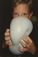 A child squeezes a white balloon. This photograph was taken while the C-SPAN crew was en route from Chicago, Illinois to Galesburg, Illinois while filming the Lincoln-Douglas Debates series.
