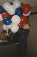 Brian Lamb finagles a large bunch of red, white, and blue balloons in a room. This photograph was taken while the C-SPAN crew was en route from Chicago, Illinois to Galesburg, Illinois while filming the Lincoln-Douglas Debates series.