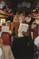 Lea Anne Long stands in a train car holding a newspaper. Red, white, and blue decorations line the car. This photograph was taken while the C-SPAN crew was en route from Chicago, Illinois to Galesburg, Illinois while filming the Lincoln-Douglas Debates series.