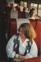 An elderly person with a C-SPAN School Bus tote bag spread on their lap sits in a train car. This photograph was taken while the C-SPAN crew was en route from Chicago, Illinois to Galesburg, Illinois while filming the Lincoln-Douglas Debates series.