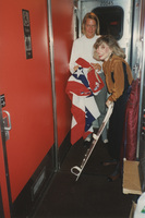 Lea Anne Long and another person stand in a train holding banners. This photograph was taken while the C-SPAN crew was en route from Chicago, Illinois to Galesburg, Illinois while filming the Lincoln-Douglas Debates series.