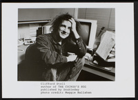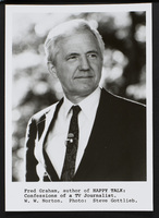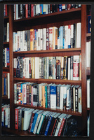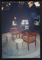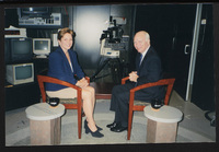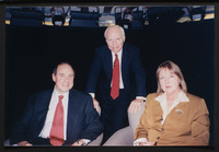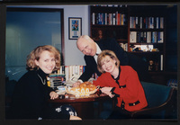 Brian Lamb poses with Carol Hellwig (left) and an unidentified person as a celebration of the 500th episode of Booknotes. On the table are several books, as well as a basket of bagels with candles showing the number "500."