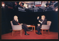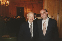 Brian Lamb poses with another person in a wood-paneled room. This photograph was taken as part of filming C-SPAN's Lincoln-Douglas Debates series in Galesburg, Illinois.